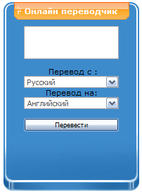 <form name="form1" action="http://perevod.bizua.com.ua/result.php" method=POST> <table border=0 cellspacing=0 cellpadding=5 name="tabl1" width="120" align="center"><center> <tr> <td colspan=5 valign=top style='border:none;'> <div align="center"> <a href="http://perevod.bizua.com.ua/"></a> <textarea rows="2" cols="17" name="srctext" wrap="virtual"></textarea> </div> </td> </tr> <tr> <td colspan=2 valign=top style='border:none;' height="100"> <div align="center"> Перевод с : <select name="from" style="width: 135px; font: 8pt Tahoma; color: #505050;"> <option value="Rus">Русский <option value="Eng">Английский <option value="Dut">Голландский <option value="Ita">Итальянский <option value="Spa">Испанский <option value="Lat">Латышский <option value="Ger">Немецкий <option value="Por">Португальский <option value="Ukr">Украинский <option value="Fre">Французский </select> <br> Перевод на: <select name="into" style="width: 135px; font: 8pt Tahoma; color: #505050;"> <option value="Eng">Английский <option value="Dut">Голландский <option value="Ita">Итальянский <option value="Spa">Испанский <option value="Lat">Латышский <option value="Ger">Немецкий <option value="Por">Португальский <option value="Rus">Русский <option value="Ukr">Украинский <option value="Fre">Французский </select> <br><br> <input id=but_tran type="SUBMIT" value=" Перевести " name="Translate" style="width: 135px; font: 7pt Tahoma;"><br> <a href="http://bizua.com.ua/export.phtml"></a></div></center> </td> </tr> </table> </form>